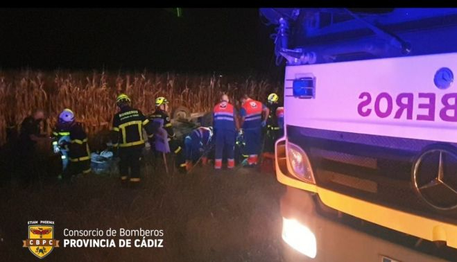Efectivos del parque de Bomberos de Jerez, adscritos al Consorcio Provincial de Bomberos de Cádiz, han intervenido este lunes noche en el accidente de tráfico por salida de vía ocurrido a la entrada de Lomopardo, barriada rural jerezana.