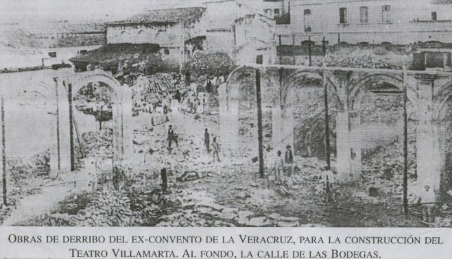 El primero en llegar y ser dominador de todo el terreno que hoy es el teatro Villamarta y Correos, e incluso la calle Medina, fue la iglesia-convento de la Vera Cruz, perteneciente a la cofradía que aún existe (de ahí viene el nombre de la calle y la de Santa María por la advocación de la Virgen de las Lágrimas venerada en la hermandad). Ese edificio inició su declive en 1835 por la Desamortización de Mendizábal. Mediante esta ley se ordenó la expulsión de la Orden de los Franciscanos Terceros, que habitaban el convento, y se subastaron los bienes tanto del convento como de la propia iglesia, que fue construida en 1551.