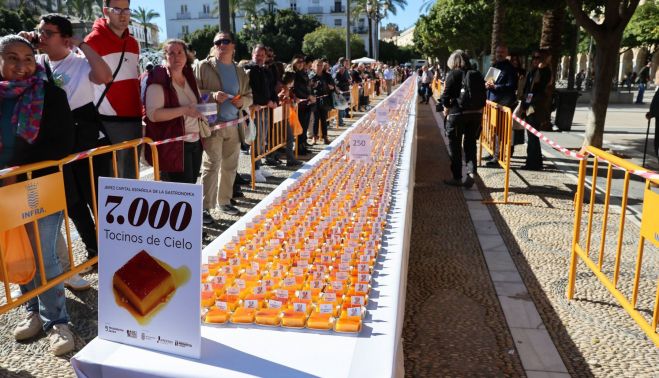 Jerez ha vivido en la mañana de este sábado uno de los momentos más dulces que se pueden vivir. La ciudad, recientemente designada Capital Española de la Gastronomía 2026, ha logrado preparar 7.000 unidades de tocino de cielo con el objetivo de rendir homenaje a uno de sus emblemas más universales y, al mismo tiempo, intentar dejar su huella en los récords de fabricación de este histórico dulce. Bajo el lema 'De Jerez al Cielo, Tocino de Récord', la iniciativa ha sido uno de los primeros grandes actos con los que la localidad gaditana ha querido demostrar por qué ha sido elegida para ostentar este título gastronómico. La cita ha servido para reivindicar un postre profundamente ligado a la identidad y a la historia de la ciudad.