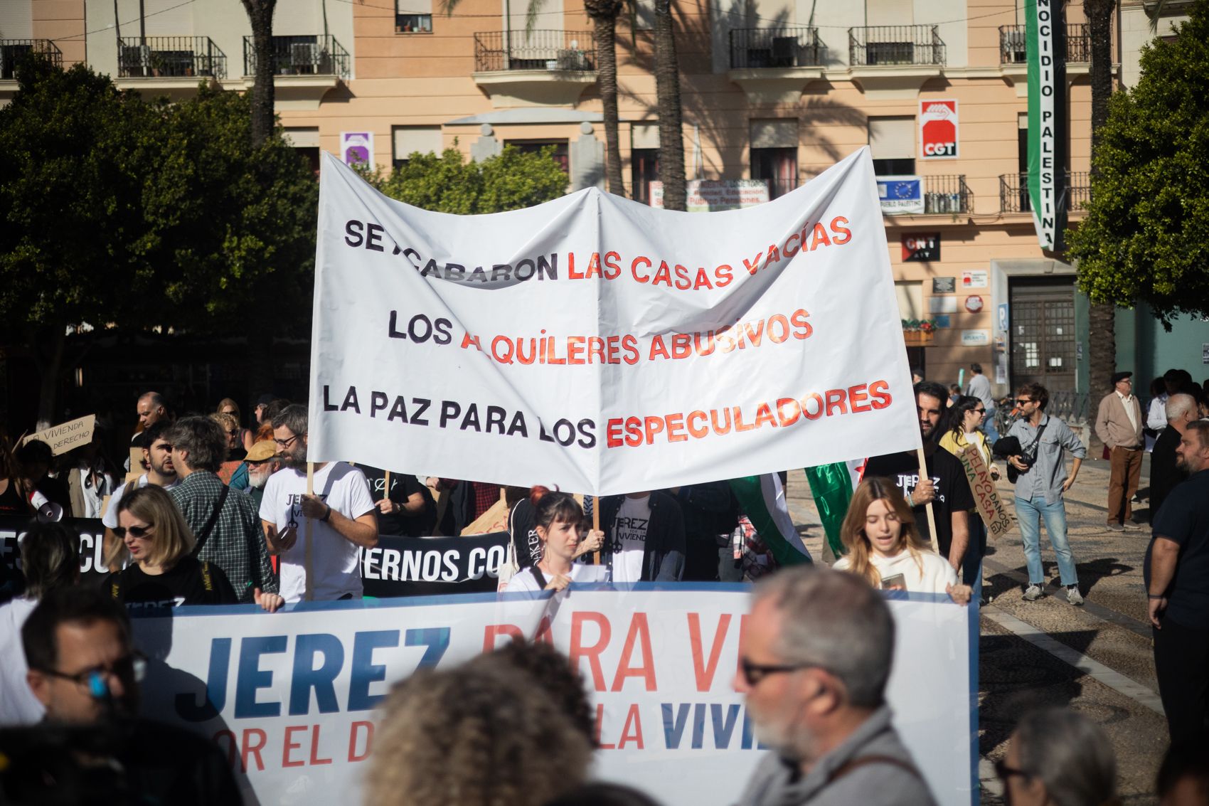 La manifestación, con el lema Jerez para vivir, está enmarcada dentro de las movilizaciones por el derecho a la vivienda que comenzaron el pasado mes en Madrid, hace dos semanas en Sevilla, Málaga y Cádiz, y este mismo 23 de noviembre en Barcelona y Burgos. La convocatoria comenzó a las 12:00 horas en la plaza del Arenal, donde se congregaron centenares de personas —algunas fuentes apuntan a más de 1.000 asistentes—, con una importante asistencia de jóvenes, y presencia de representantes de varios partidos políticos, como el parlamentario andaluz y portavoz de Adelante Andalucía, José Ignacio García, la concejala de Ganemos Jerez Kika González, la coordinadora local de IU Violeta Márquez y miembros del círculo de Podemos en la ciudad, entre otros.