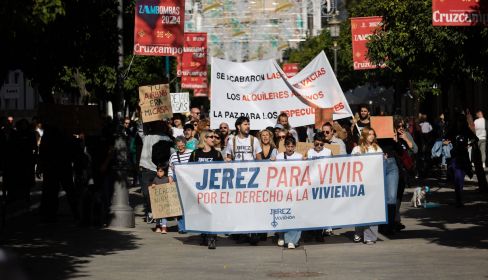 "En los últimos 10 años, el precio del alquiler en Jerez ha subido un 65%, mientras que los salarios apenas han crecido un 3,5%. El acceso a la vivienda en este país y en nuestra ciudad se ha convertido en un imposible para gran parte de la población, que tiene que elegir entre pagar el alquiler o dar de comer a sus hijos. Solo el 15% de nuestras jóvenes pueden salir de casa de sus padres, y la media de edad con la que lo hacen es de 30 años, ni siquiera tener trabajo te garantiza tener un techo bajo el que poder vivir", dice el manifiesto leído por los miembros de Jerez por la Vivienda, que hacían referencia además a las personas migrantes, racializadas, mujeres, personas del colectivo LGTBI y discapacitadas, "colectivos más precarizados y vulnerables" ante esta situación.