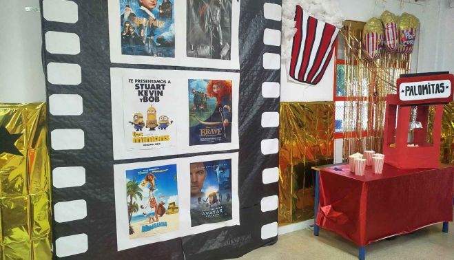 Al escenario que han montado en la zona de Infantil no le falta ni un detalle, con una taquilla muy especial, una zona para la venta de palomitas, las carteleras, el paseo de las estrellas y, por supuesto, las butacas y la gran pantalla.