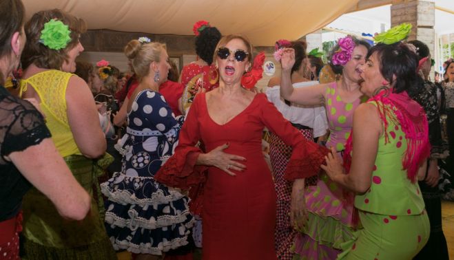 "La gente no se puede imaginar la afición que hay en el Norte con el Sur", aclama una asturiana vestida de gitana. El grupo ocupa todo el interior y la parte de terraza de la caseta de lavozdelsur.es. Entre macetas de rebujito, pescaíto frito, carrillá y tortilla, un grupo de mujeres se arranca por sevillanas, desde las mismas mesas, sentadas. Algunas pertenecen a coros rocieros, como el Coro del Principado de Asturias o el Coro de Gijón, pero otros muchos se añadieron por pura afición al baile, además de por amor a Andalucía.