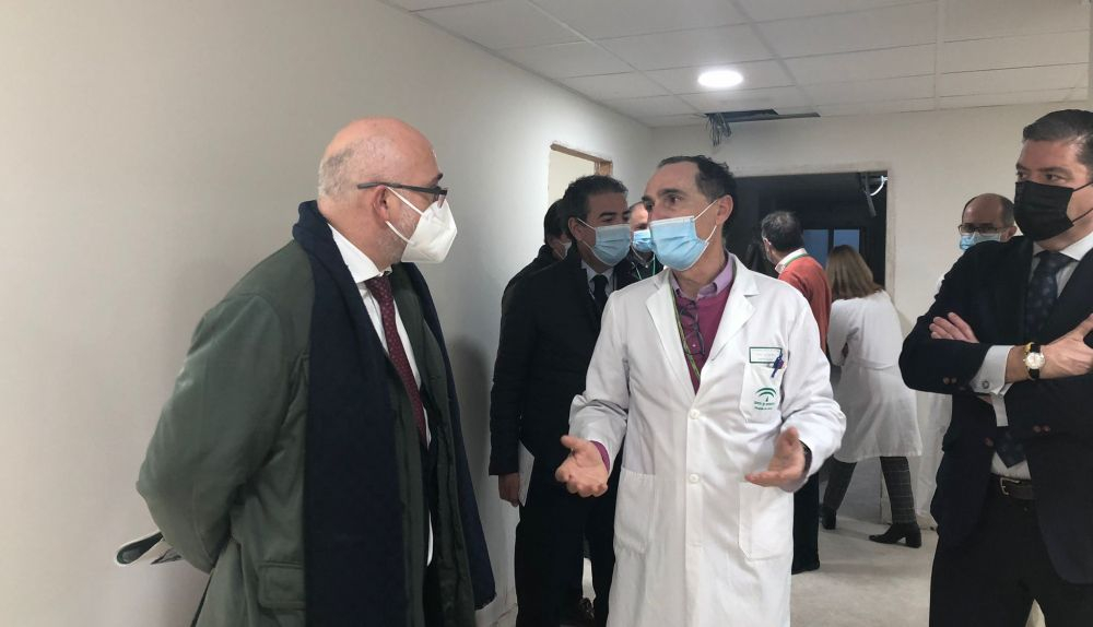 El secretario general de Investigación, Desarrollo e Innovación de la Consejería de Salud y Familias, Isaac Túnez; el gerente de la Fundación Pública Andaluza Progreso y Salud, Gonzalo Balbotín; y la delegada territorial, Isabel Paredes, junto al gerente del Área de Gestión Sanitaria de Jerez, Costa Noroeste y Sierra de Cádiz, Miguel Ángel Ortiz, y parte de su equipo directivo, han visitado hoy las obras de esta unidad, que se llevan a cabo desde el pasado mes de diciembre y en la que se invertirán más de 120.000 euros.