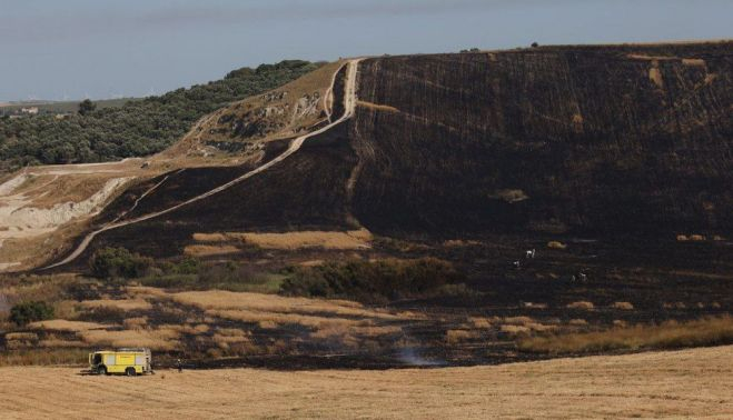 Una enorme loma, a espaldas del campo de golf de Guadabajaque, en Jerez, luce negra tras el incendio desatado este martes, que ha calcinado varias hectáreas de terreno, sin que haya que lamentar daños materiales.