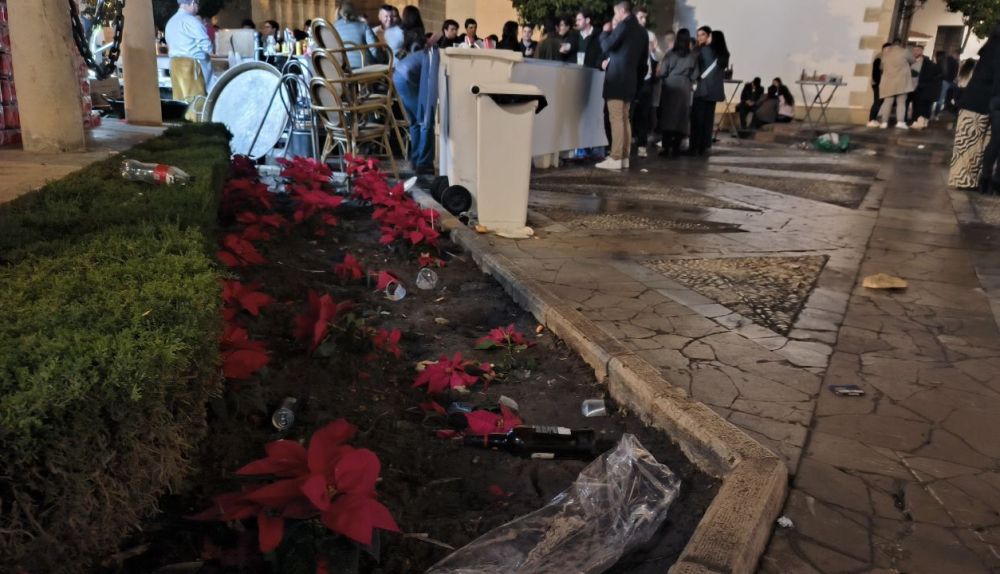 Vasos vacíos en las escaleras y en los poyetes del Belén de luces de la plaza de la Asunción, en Jerez. Botellines tirados entre las flores de pascua y latas esparcidas por el suelo. Esta es la imagen que presentaba esta ubicación de la ciudad este sábado a medianoche.