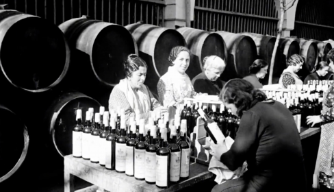 En el video, se ve la labor de las mujeres que se empleaban para colocar etiquetas de Domecq, en concreto de amontillado.