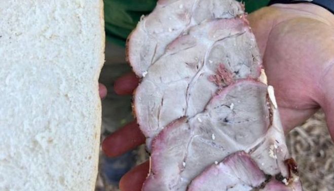 Según relatan, tras la larga jornada de extinción del incendio, "los retenes reciben un bocadillo seco con una carne de aspecto dudoso y con pinta de estar en mal estado".