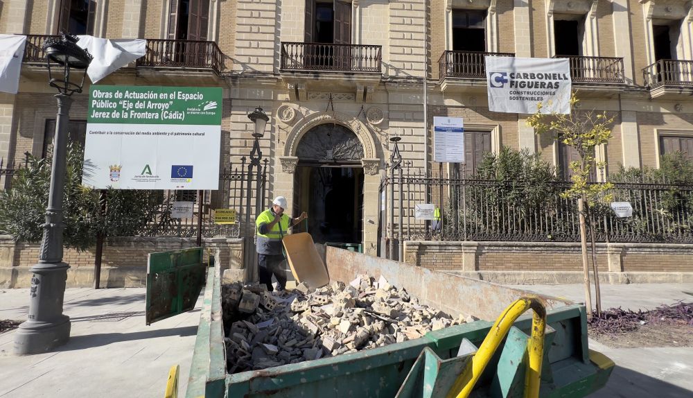 Los operarios se afanan estos días en las labores de pequeñas demoliciones y desescombros para reconvertir este palacio del siglo XIX, y que el Ministerio del Interior subastó el pasado 2022, en un sugerente hotel como puerta de entrada al intramuros jerezano.
