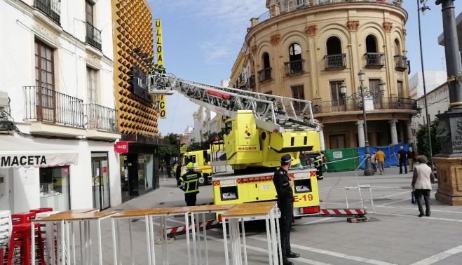 El fuerte viento que está azotando Jerez este lunes 19 de octubre está provocando diversos desprendimientos en la ciudad. Además de ramas caídas, lonas y carteles, ha estado a punto de destrozar el mítico cartel de Ulloa Óptico en la calle Larga. Los bomberos han tenido que intervenir para evitar desprendimientos, tanto en esta zona como en otras, como Ermita de guía