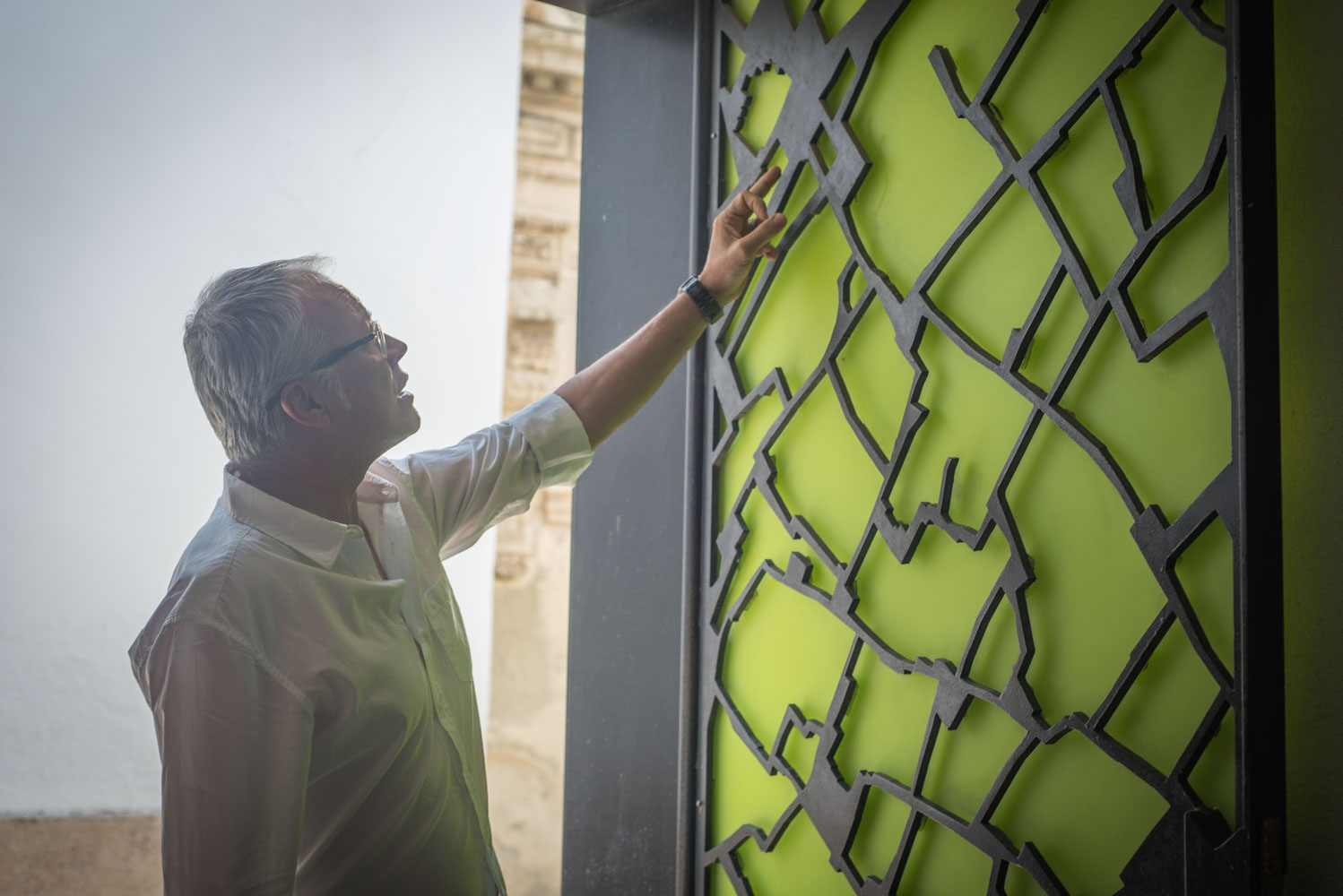 Hasta 2008 no pudo entrar a vivir la pareja. La obra en sí duró dos años, pero entre medias hubo que lidiar con licencias, permisos, intervenciones arqueológicas y trabas de Urbanismo, sobre todo en lo relativo a la normativa sobre la construcción de patios. Además del exterior, los arquitectos diseñaron otros interiores, en la primera planta, para que relacionaran las distintas dependencias de la casa. “La normativa dice que un patio tiene que llegar hasta la planta baja, pero luego vieron que era una cosa sin importancia y se pudo sacar el proyecto adelante”, explica el arquitecto Jesús Orúe, que añade que en la vivienda también destacan elementos de cerrajería, como la que se contempla en la puerta de acceso. Lo que a simple vista parecen unas formas hechas sin un trazado fijo no es más que un mapa del centro de Jerez, mientras que en las escaleras también hay unas planchas de aluminio con trazos muy originales inspirados en la cultura marroquí.
