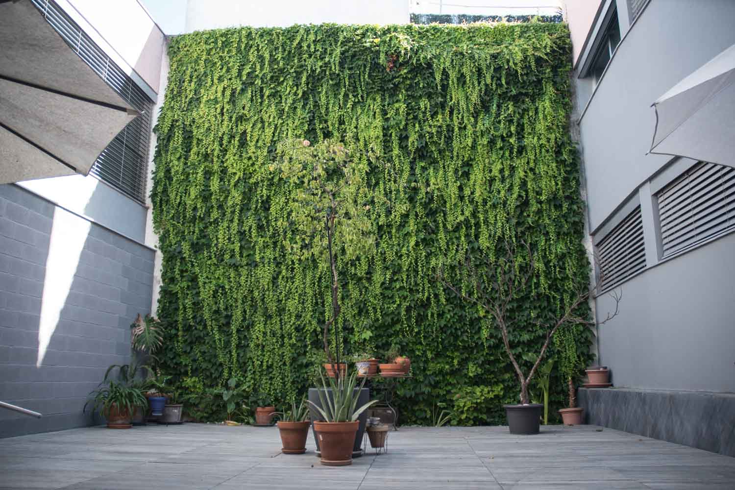 En 2001 adquirieron la finca y encargaron el proyecto a los arquitectos Jesús Orúe y Pedro Ledo, que plantearon un edificio de fachada diáfana, blanca, sin cornisas y sin ventanas a la plaza, pero sí a un patio central en el que llama la atención una frondosa parra virgen que cubre una de las paredes. “Realmente, las antiguas casas de vecinos tampoco tenían ventanas al exterior, sino al patio central, que al fin y al cabo era donde se hacía vida”, recuerda Manuel. La luz solar también entra desde la cristalera de la terraza, amplia, que da a la plaza Ponce de León y desde la que se divisa perfectamente el precioso ventanal del palacio renacentista que ocupa el colegio del Salvador.