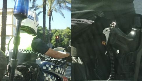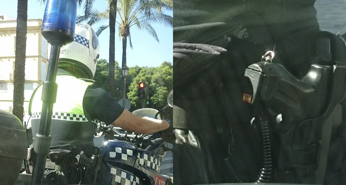 "El lunes, volviendo a comer a casa, me paro en un semáforo con mi coche y un policía local motorizado se para a mi lado. Cuando lo miro me llevo la sorpresa de que lleva una pegatina de la bandera de España con el águila franquista en la culata de la pistola", escribe un usuario en redes sociales, adjuntando las fotos que acompañan a este artículo. "Me parece una falta de respeto y de educación. Creo que debería ser ilegal. ¿Te imaginas la policía alemana con pegatinas de esvásticas en sus coches?", se pregunta este jerezano, quien añade: "Se sorprende la gente de que los Mossos de escuadra defiendan a su pueblo y nos parece normal que un policía local de Jerez enaltezca el fascismo de este país".
