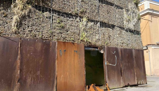 En los últimos días, al muro seco y amarillento de plantas abandonadas, se suma que una de las cubiertas metálicas de los bajos de la instalación se ha podrido, quedando chafada en el suelo y abriendo un hueco enorme hacia el exterior de esta pantalla. Además, el sistema de riego de la instalación parece averiado, lo que habría acelerado dicha podredumbre del metal, aunque también se encuentra vertiendo un fino y constante hilo de agua a la vía pública. ¿Nadie va a actuar para recuperar esta bonita esquina en pleno centro de Jerez?