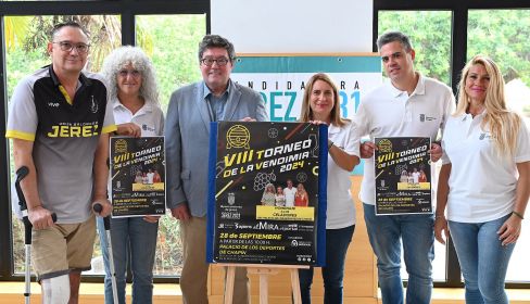 El delegado de Deportes, José Ángel Aparicio, acompañado del presidente del Club Deportivo Unión Baloncesto Jerez, José María Rosado, y de María Gallego, en nombre de los celadores y celadoras del Palacio Municipal de Deportes de Chapín, ha presentado el VIII Torneo de la Vendimia de Baloncesto que se celebrará el próximo sábado, día 28 de septiembre, a partir de las 10 horas, a beneficio de los comedores sociales de Jerez.