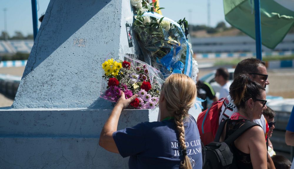 Miguel Ángel confiesa que se emocionó cuando escuchó el fatídico desenlace. "La mejoría de la muerte", se dijo así misma Carmen Jiménez cuando se enteró del fallecimiento de Ángel Nieto a los 70 años. Si bien los médicos dijeron este miércoles que el campeonísimo del mundo estaba en proceso de despertar —después de ser embestido por detrás por un coche mientras viajaba en quad el pasado 26 de julio en Ibiza— sufrió un endema cerebral totalmente inesperado. "A mi abuelo le pasó lo mismo. El día antes estaba bien y luego al día siguiente falleció", incide esta motera jerezana que hoy se acerca al monumento del piloto zamorano —crecido en Madrid— en el Circuito de Jerez. Fue sobre las siete de la tarde del pasado 3 de agosto cuando el mundo conoció la trágica noticia. "No se lo llevó una moto, sino un quad", es una de las sentencias que se oyen en la curva de Ángel Nieto de Jerez y que pronuncia Miguel Ángel, que no ha querido perderse el acto junto a su hija Alba, que ya empieza a ser una apasionada de las dos ruedas.Ramos de flores, un casco firmado, una bandera española donde alguien pintó: "Ha muerto un ángel y hoy nace un mito. En Chiclana, 4 de agosto de 2017", velas, una pegatina que reza: "Siempre te recordaremos"... Ángel Nieto se marcha recibiendo toda la admiración de una afición que estuvo siempre sentada en la grada o pegada a la televisión para verlo ganar. Y ahora, da igual que sea verano, el mundo se para para honrar al piloto sobre dos ruedas. "Da igual que sea vacaciones, todos los moteros nos vamos a concentrar", asegura un admirador del piloto zamorano.