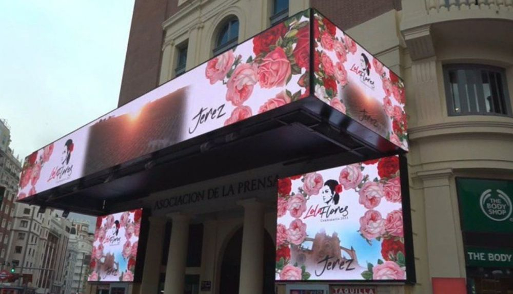Cualquier madrileño o turista que camine por la Gran Vía de la capital española podrá contemplar en las pantallas de gran formato que hay en dicho lugar una acción promocional, lanzada por el Ayuntamiento de Jerez, que tiene a Lola Flores como principal protagonista. Un total de 320 spots se proyectarán al día (2.240 a la semana), hasta el 12 de febrero, en las cinco pantallas de la fachada del emblemático edificio de la Gran Vía. El Palacio de la Prensa, situado en la plaza de Callao, está considerado como uno de los soportes “de prestigio” de la popular artería madrileña.