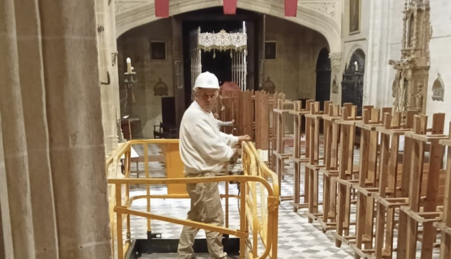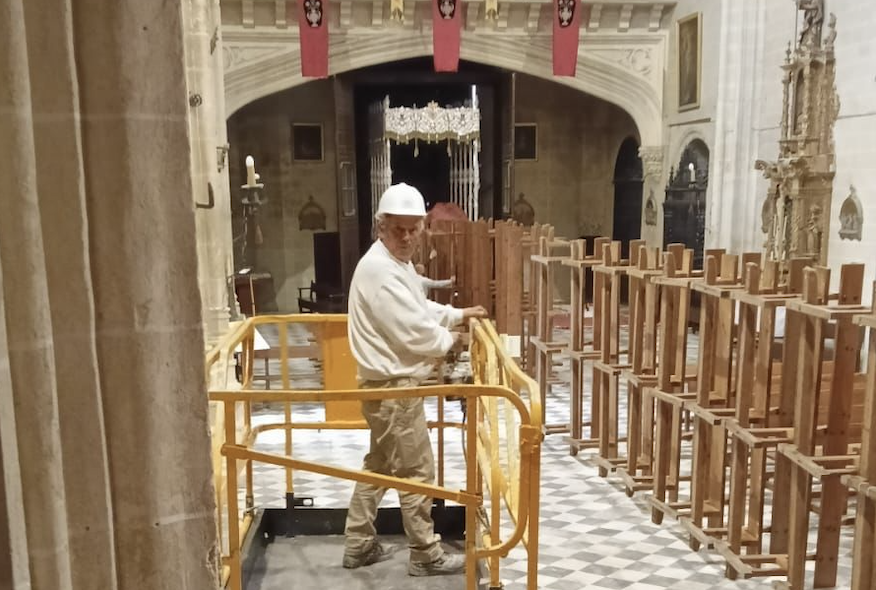 Este miércoles han comenzado los trabajos de colocación de una malla por toda la nave central de San Marcos, en el intramuros de Jerez, desde el coro al presbiterio, como medida de protección ante la posibilidad de que se produzcan nuevos desprendimientos.