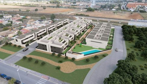 El conjunto principal se organiza en torno a un paseo peatonal ajardinado con palmeras y ofrece distintas tipologías, desde adosados con sótano, bajos con jardín y áticos con amplias terrazas y solárium, todos ellos con garaje en sótano y trastero. El proyecto se completa con una tipología adicional de adosados con garaje en superficie, integrados en el mismo residencial y con acceso a todas las zonas comunes, en un entorno tranquilo y bien conectado, dentro de un barrio residencial consolidado.