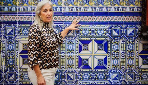 Junto a los bancos, muestra un trozo del mosaico que adorna las paredes, otra de sus restauraciones recientes. Después, su mirada se dirige a un gran cuadro colgado cerca del techo que presenta 14 azulejos del siglo XVI restaurados por ella misma. “Se me ocurrió ponerlos en forma de cruz porque encajaban muy bien”, explica Mercedes, que recuperó el esplendor de estas piezas que representan símbolos de la Pasión.