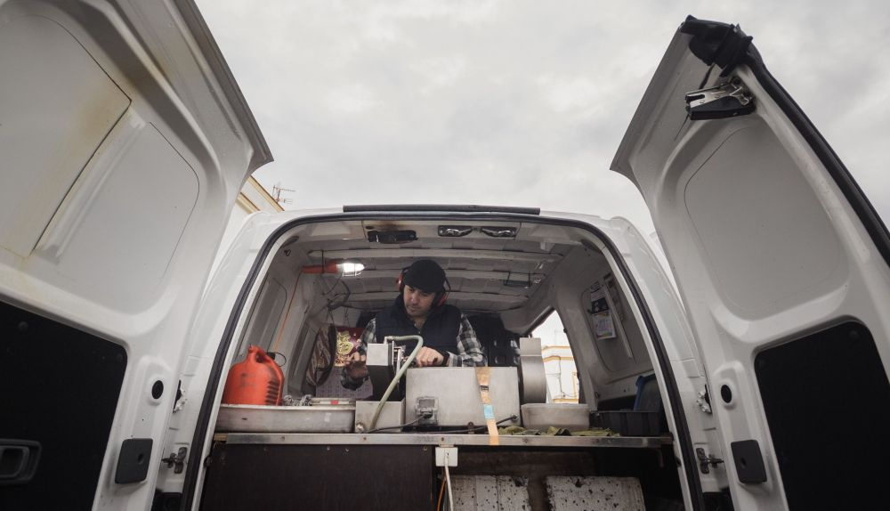 José Miguel Abucha trabaja como afilador. Es una de las últimas personas que se dedican a este oficio en Jerez y, a pesar de lo que se pueda pensar, no es un veterano en estas lides. Más bien, un afilador 2.0, que viaja en furgoneta, donde tiene su taller móvil, a diferencia de los antiguos que lo hacían en moto, usando técnicas "respetuosa con el material".