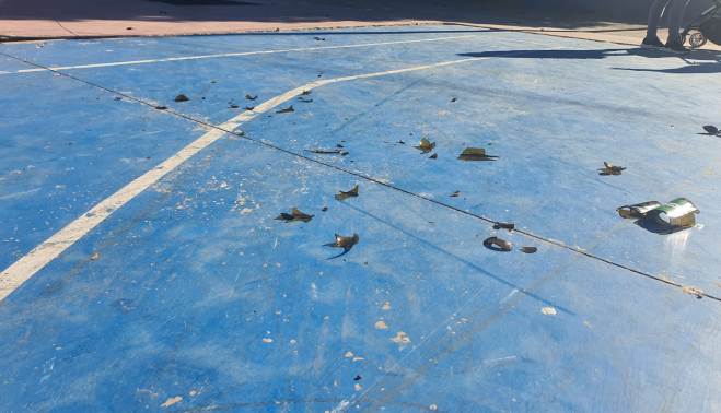 Es el caso de las inmediaciones del colegio Poeta Carlos Álvarez, cuya falta de mantenimiento se ha traducido en la existencia de agujeros en las aceras, un parque del que ya no quedan ni los columpios, con canastas y porterías rotas y con unas pistas cuyos límites no están sellados y que amanecen "día sí y día también" regadas de cristales procedentes de botellas rotas.