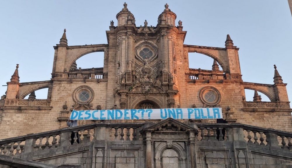 El inicio de esta campaña ha tenido lugar en la Catedral de Jerez con una pancarta en la que se puede leer '¿Descender? Una polla'. Dicha foto ha sido la que más revuelo ha causado por la localización, ya que algunas opiniones en redes expresan que no es una expresión apta para promoverla frente a uno de los edificios más significativos de la ciudad.
