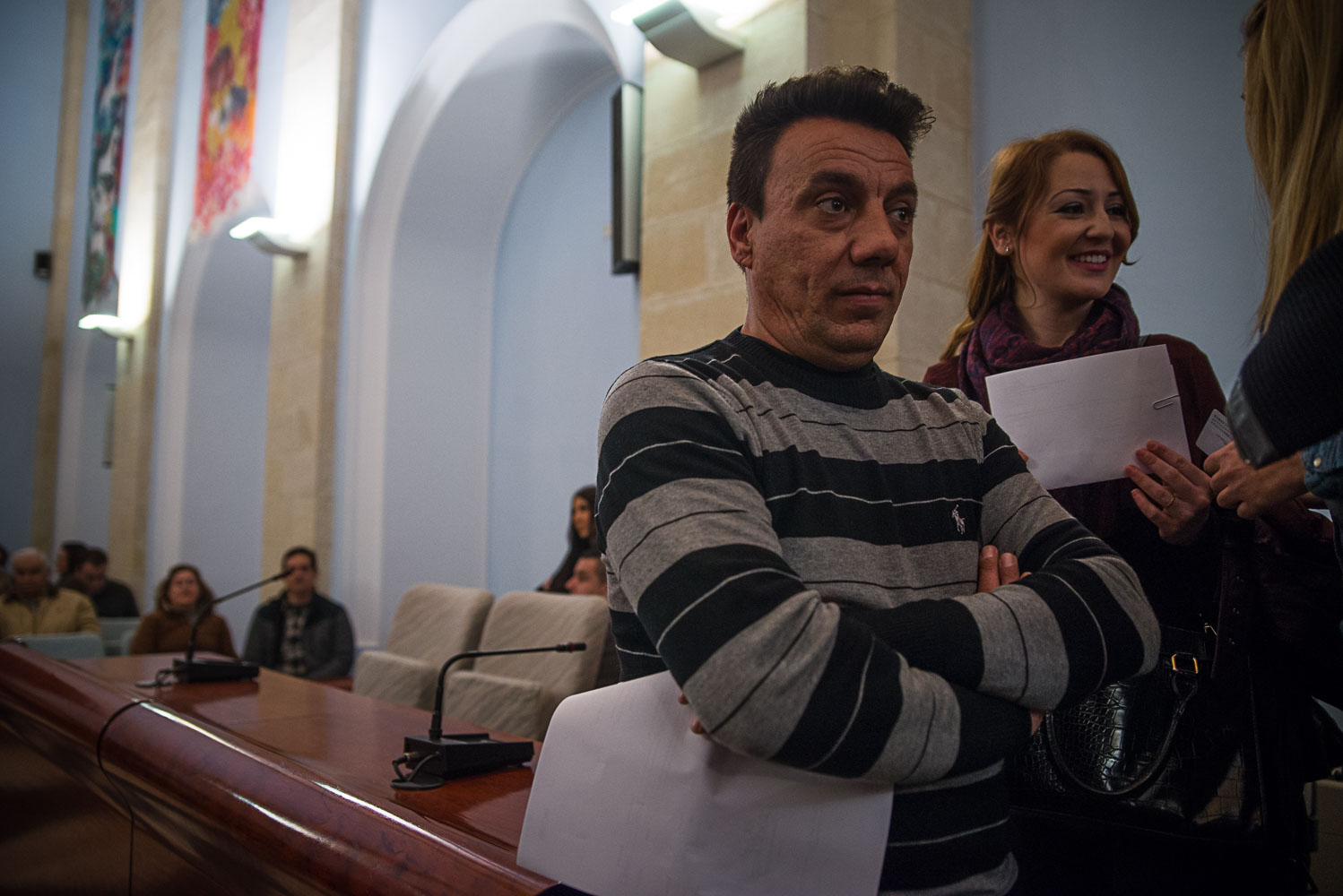Una pareja espera su turno para recibir el cheque. Ellos abonaron 26.000 euros. “Al principio nos llevamos un chasco, pero hemos seguido con nuestra vida”, señalan. “Fue una putada”, asegura él, que confiesa que no esperaban recuperar la inversión. Como tampoco confiaba en hacerlo Francisco Javier, otro de los afectados. Él, que trabaja en un supermercado, abonó 27.000 euros para hacerse con una unifamiliar de 150 metros para poder vivir con su mujer y su hijo pequeño. “Esto es la Lotería del Niño”, dice entre risas, asegurando que usará el dinero para pagar deudas, “que tengo más trampas que Tarzán”, apunta.
