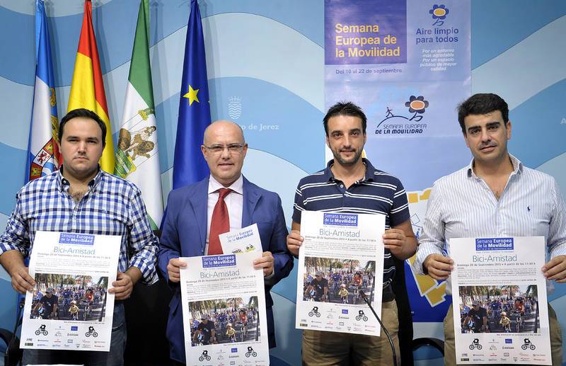 A la presentación de la Semana de Europea de Movilidad a la que se han sumado distintos colectivos de la Mesa de Movilidad, han asistido junto a José Antonio Díaz los representantes de las principales firmas patrocinadoras de los eventos que componen como Carlos Ruiz, en representación de “Navarro Hermanos”, Manuel Herrero, en representación de “Alcampo”, y Miguel Román, secretario de la Asociación “Juventud hacia el Futuro”, del Distrito Sur y a la que irán destinados los fondos recaudados en la Ruta Solidaria a Pie patrocinada por Alcampo.