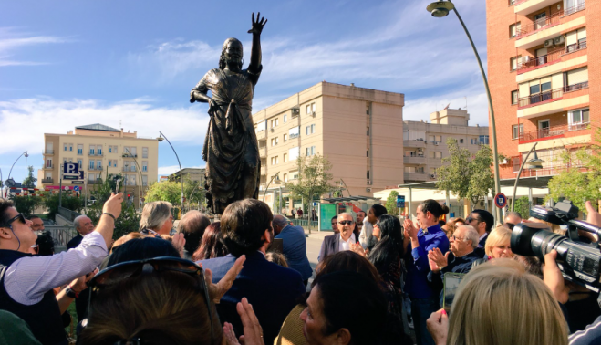 Familiares y amigos de la gran artista flamenca e instituciones y entidades relacionadas al cante jondo inauguran el monumento a Manuela Méndez del escultor Sebastián Santos Calero, en la plaza Madre de Dios.