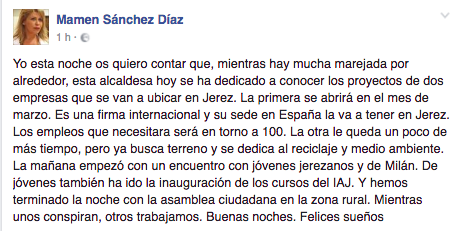 El texto completo que ha publicado la alcaldesa en su cuenta personal reza así: "Yo esta noche os quiero contar que, mientras hay mucha marejada por alrededor, esta alcaldesa hoy se ha dedicado a conocer los proyectos de dos empresas que se van a ubicar en Jerez. La primera se abrirá en el mes de marzo. Es una firma internacional y su sede en España la va a tener en Jerez. Los empleos que necesitará serán en torno a 100. A la otra le queda un poco de más tiempo, pero ya busca terreno y se dedica al reciclaje y medio ambiente. La mañana empezó con un encuentro con jóvenes jerezanos y de Milán. De jóvenes también ha ido la inauguración de los cursos del IAJ. Y hemos terminado la noche con la asamblea ciudadana en la zona rural. Mientras unos conspiran, otros trabajamos. Buenas noches. Felices sueños".