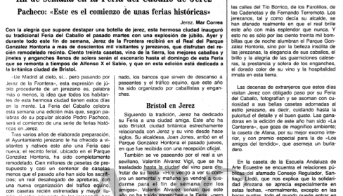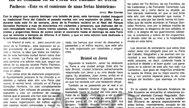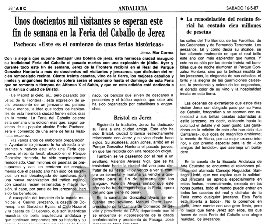 Aquella Feria del 87 del siglo pasado, dedicada a Bristol y en la que estuvieron presentes la propia alcaldesa de la ciudad británica, Joan Jones; el entonces ministro de Trabajo, Manuel Chaves; el vicepresidente del Gobierno, Alfonso Guerra, e incluso Rocío Jurado, fue el principio de la Feria que conocemos hoy. Incluso hace referencia ABC en su crónica a la nueva arquitectura del recinto, con las singulares portadas de cada acceso al González Hontoria. "Entre la nueva remodelación están las portadas por las que se tiene acceso al recinto y que ya son conocidas por los jerezanos como el Exín Castillo, por su estructura y color; la cruceta central está adornada por las tradicionales botas de jerez, el albero adoquinado, los bancos que sirven de descanso a paseantes y el tráfico equino, que este año ha sido organizado por caballistas y enganches". Aun así, en aquella Feria aún seguían en pie cinco casetas de mampostería a las que no llegó a tumbar la piqueta. "Estas cinco casetas también son de propiedad municipal y cuando acabé la Feria estará destinadas a actos culturales y sociales. Este será el comienzo de una serie de ferias históricas; todo esto ha costado cien millones que, si aún no están pagados, ya se pagarán", afirmaba Pacheco, fiel a su estilo casi desde sus inicios como gobernante de la ciudad.