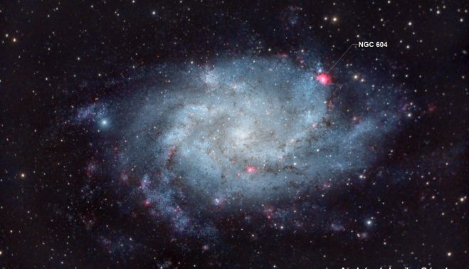 La galaxia del Triángulo catalogada como M33 o NGC598, toma su nombre de la constelación en la que se encuentra, la pequeña constelación de Triangulum. Es la tercera más grande de nuestra vecindad, de una treintena de galaxias (grupo local), después de Andrómeda y la Vía Láctea, y nos muestra sus brazos casi de frente (con un inclinación de unos 58º).