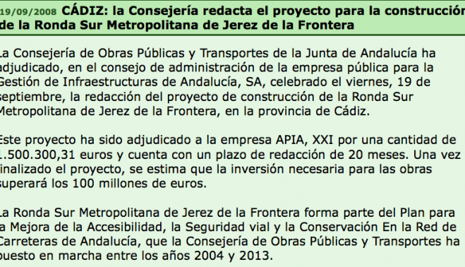 El parlamentario andaluz, Antonio Saldaña, ha denunciado que el PSOE, a través de la Consejería de Fomento de la Junta de Andalucía, “oculta” el proyecto de la Ronda Sur de Jerez y "no da explicaciones de qué ha pasado con un proyecto que debería estar más que redactado y que se anunció en el año 2008 por 1,5 millones de euros". En este sentido, el dirigente popular recuerda que "incluso se avanzó que la inversión total en esta infraestructura alcanzaría los 106 millones de euros". Igualmente, ha insistido en que "es incomprensible que en el PISTA 2020 se contemple la elaboración de un proyecto que debía estar elaborado desde el año 2009 y que se adjudicó por 1,5 millones de euros a la empresa APIA XXI SA".