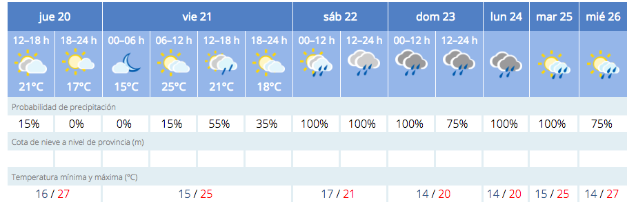La jornada del domingo será igualmente lluviosa, aunque la AEMET no decreta ningún tipo de alerta. El fin de semana las temperaturas no sobrepasarán los 22 grados y las mínimas no bajarán de los 14.