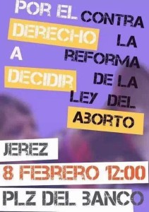 La Plataforma Social de Jerez, junto con otras organizaciones sociales y políticas de la ciudad, ha convocado para el próximo sábado 8 de febrero, a partir del mediodía, en la Alameda del Banco una concentración contra la reforma de la ley del aborto de Gallardón y a favor del derecho a decidir. De esta manera la 'marea violeta', que durante este fin de semana se ha reproducido en numerosos puntos de la geografía española y en los alrededores de la convención nacional del PP celebrada en Valladolid, hará parada en la ciudad con el objetivo de reunir a cientos de jerezanos y jerezanas para dejar de manifiesto, en palabras del Área de Igualdad de IU Jerez, "nuestro más enérgico rechazo a la Ley del Aborto planteada por el Gobierno Central del Partido Popular, que supone de facto la eliminación del derecho de la mujer a decidir sobre su maternidad".