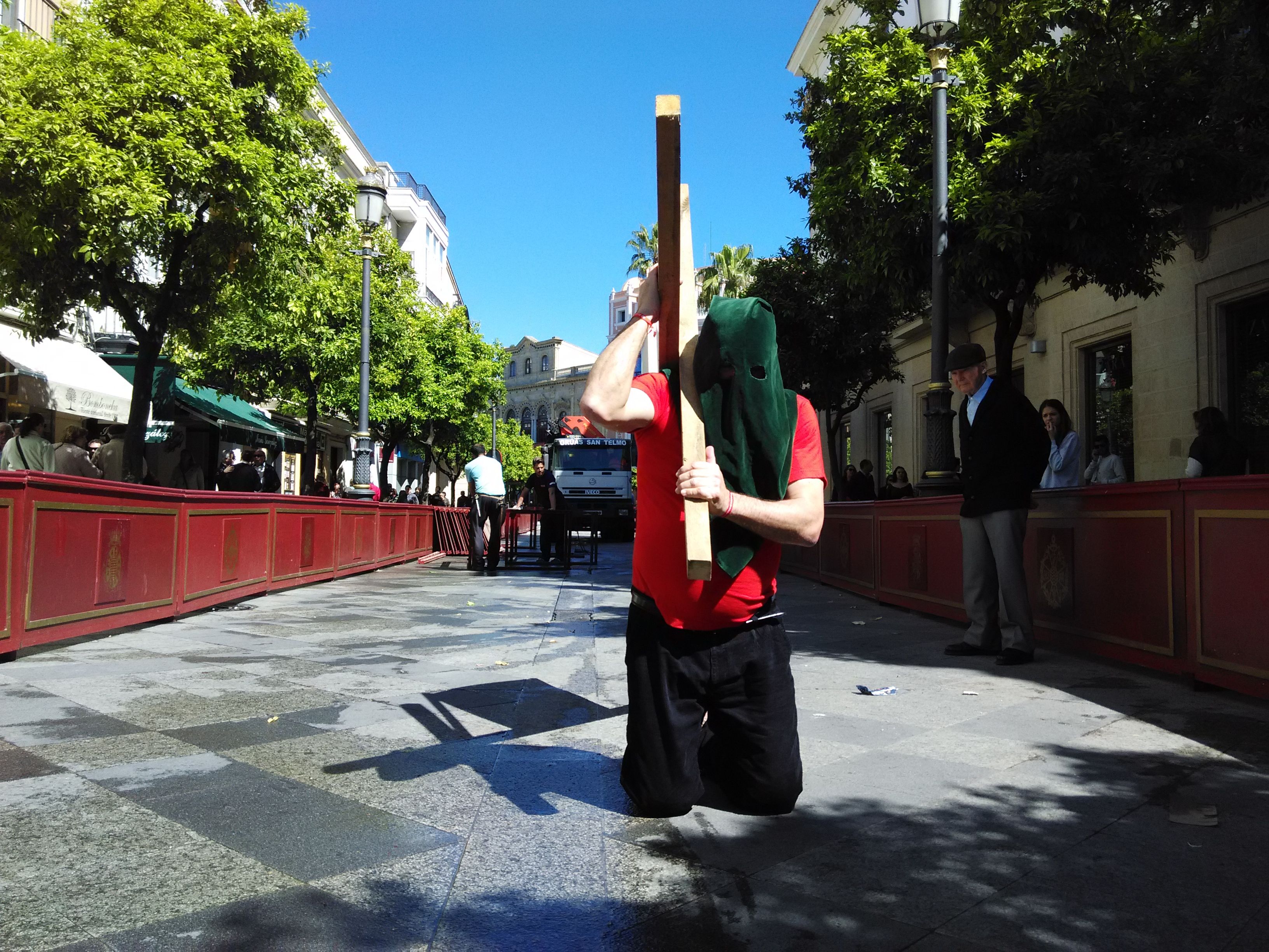 Con un capuz de color verde, descalzo, cadenas en los pies y una cruz al hombro. Así y todo, la mayor carga de Juan Carribero es saber que su hijo Marcos necesita otra nueva operación en Boston (EEUU) y que no tiene medios para mandarlo allí. Tanto él como su familia reclama a la Junta de Andalucía que subvencione la operación de Marcos, como hizo en su día el gobierno de Aragón con una niña que también necesitaba una intervención cardiaca en Estados Unidos.