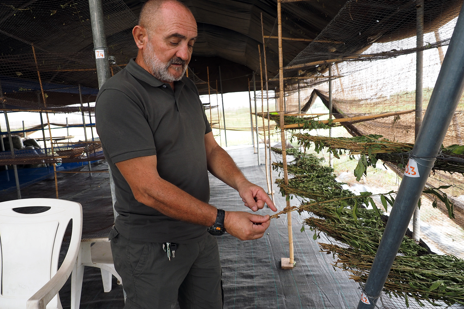 Cuando se realiza el corte, la planta pasa al secadero. Allí se lava bien para eliminar hojas y demás impurezas. Luego se coloca en unos paneles donde permanece tres días, si ayuda el levante, o siete, si no lo hace. “Si tarda más se retrasa el proceso”, apunta Luis. “Si cortas y no consigues secar estás muerto, hay que llenar el secadero pero ir vaciando también”, añade. Luego se ripia la planta para quitarle el tallo y se embolsa. Cada bolsa, de unos tres kilos. Así se la vende a productores alemanes. Aquí todavía no puede.
