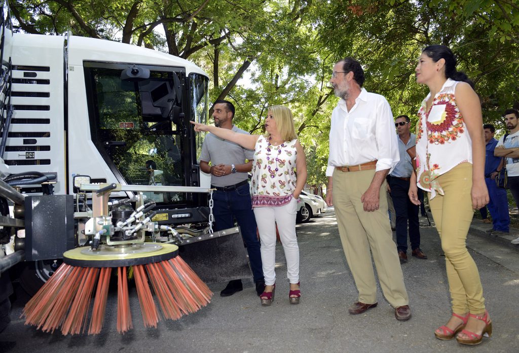 La alcaldesa, Mamen Sánchez, junto al teniente de alcaldesa de Medio Ambiente, José Antonio Díaz, la delegada de Coordinación de Distritos, Ana Hérica Ramos, y el gerente de la empresa concesionaria del servicio de limpieza viaria y recogida de residuos, UTE Jerez, Manuel Calderón, ha presentado un primer avance de la nueva maquinaria. La regidora ha agradecido a todas las personas que han hecho posible la puesta en marcha “de un servicio moderno y de calidad, como se merece esta ciudad, y que contará con más personal —incluyendo a personas con discapacidad—, maquinaria de última tecnología y que llegará a las barriadas con mayor rotación”.