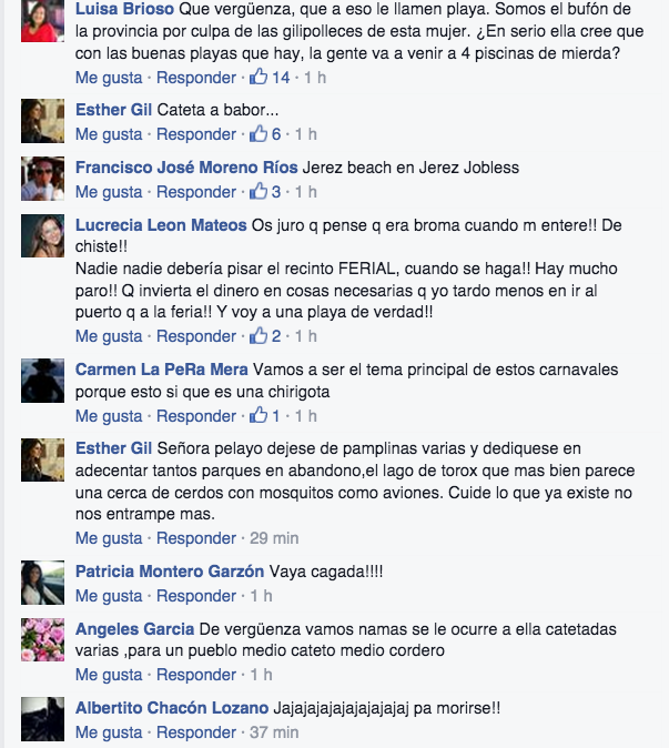 De momento, en las redes sociales, el proyecto de 'Jerez Beach' no es que haya calado mucho, todo lo contrario. En Facebook, Luisa Brioso afirma: "Que vergüenza que a eso le llamen playa. Somos el bufón de la provincia por culpa de las gilipolleces de esta mujer. ¿En serio ella cree que con las buenas playas que hay, la gente va a venir a 4 piscinas?" De otro lado, Lucrecia León opina que "¡Pensé que era broma cuando m entere! ¡De chiste!! ¡Nadie nadie debería pisar el recinto ferial cuando se haga! ¡Hay mucho paro! ¡Que invierta el dinero en cosas necesarias, que yo tardo menos en ir a El Puerto que a la feria! ¡Y voy a una playa de verdad!" Esther Gil, mientras, señala: "Señora Pelayo, déjese de pamplinas varias y dedíquese en adecentar tantos parques en abandono, el lago de Torrox más bien parece una cerca de cerdos con mosquitos como aviones. Cuide lo que ya existe y no nos entrampe más". Mientras, Carmen La Pera cree que "vamos a ser el tema principal de estos Carnavales, porque esto sí que es una chirigota".
