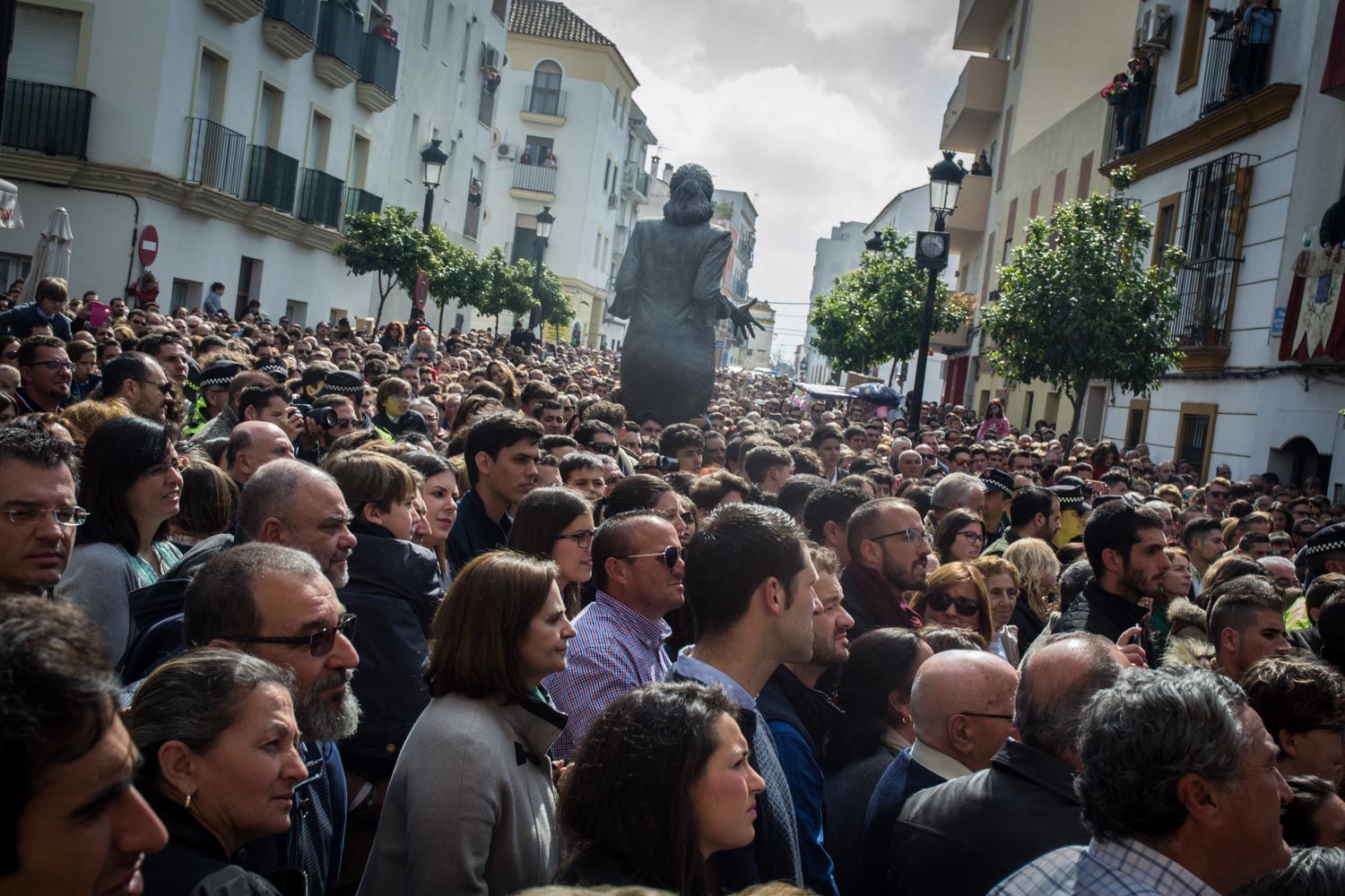 Sentencia: curioso nombre y término. ¿Cuántas lecturas se pueden sacar de dicho concepto? El Señor sentencia una madrugada con un recorrido de 10 horas. Él es el último en recogerse, y nunca mejor dicho porque las damas van primero, siendo el único misterio de Jerez que aguarda a que el palio se recoja antes que él, debido a las dimensiones de su pequeña sede. La espera con mimo y paciencia en la media circunferencia que rodea la capilla de La Yedra. En su corona de espinas, alguno de esos pétalos de rosa lanzados minutos antes, que parece que quisieran mitigar su dolor. Abajo la gente se encuentra apelotonada. La Plazuela está abarrotada y los espectadores llegan ya hasta Madre de Dios. La Paquera nunca ha estado tan solicitada. La Policía Local tiene que crear una valla imaginaria para que la Esperanza llegue y revire elegantemente para saludar a su hijo.