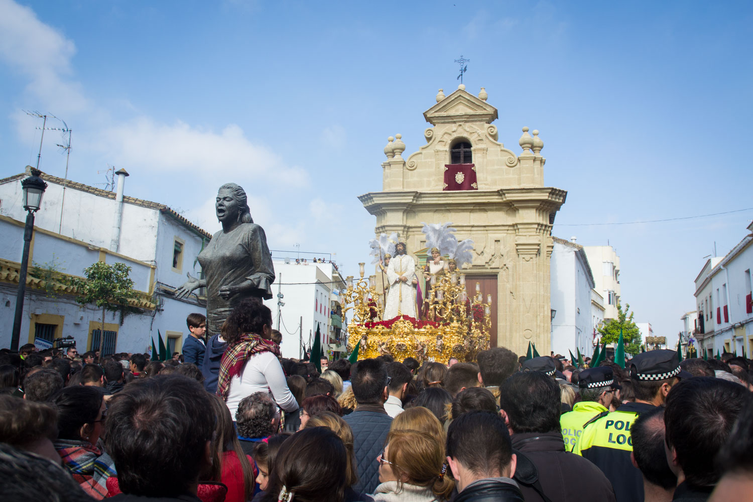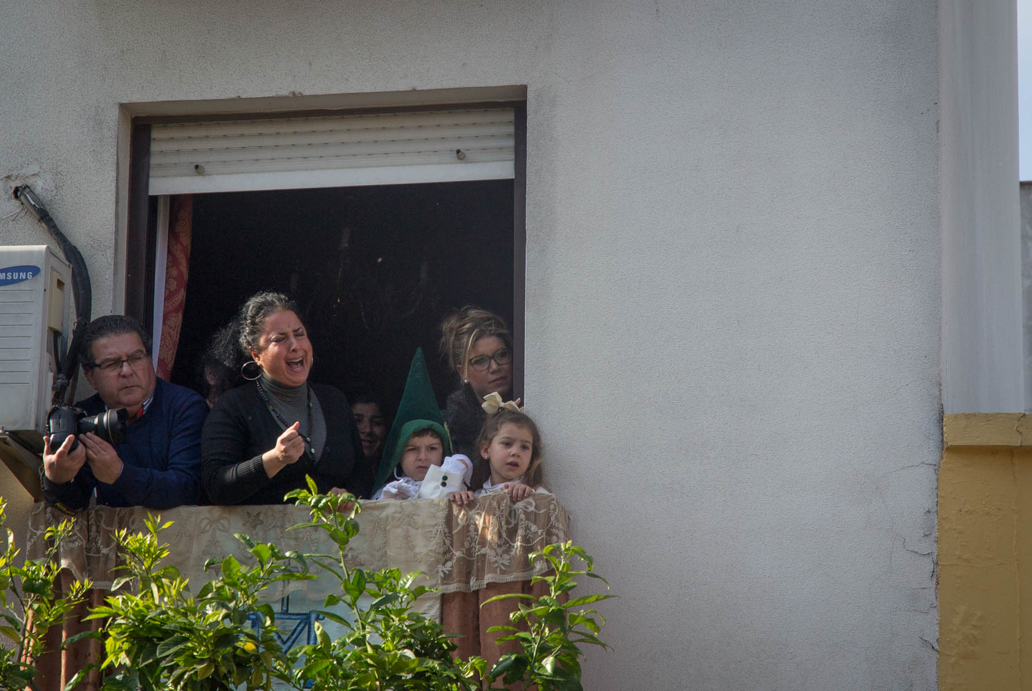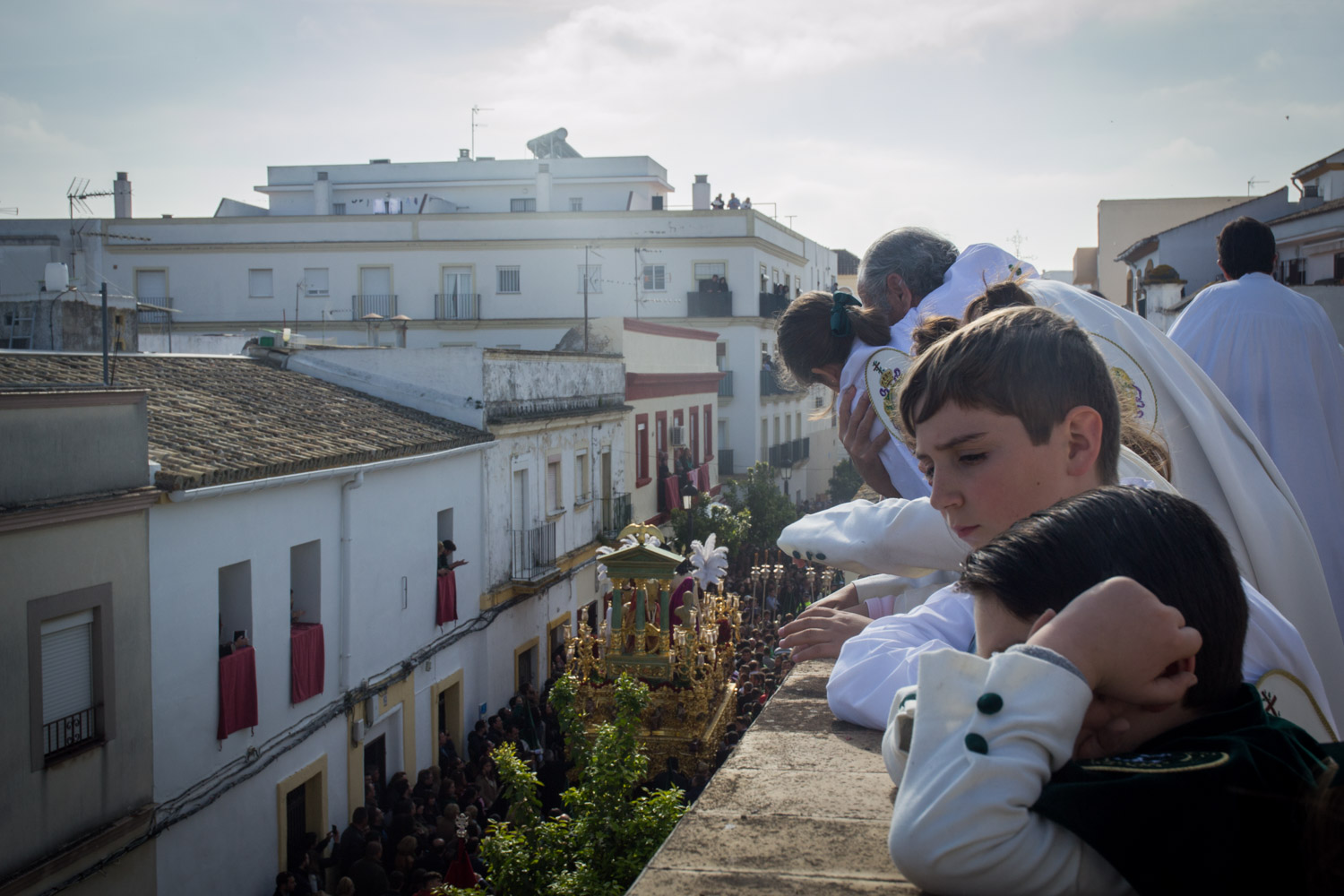 Minutos antes llovieron pétalos desde ambos flancos de la calle Sol. Los balcones tiñen de rojo el cielo para santificar a los protagonistas de la mañana. Pequeñas cabezas aparecen tímidamente desde la azotea de la hermandad. La pavera y parte de los 130 pequeños nazarenitos que tiene a su cargo suben a lo más alto de la casa de hermandad para divisar con tranquilidad -lejos del alboroto de la plaza- la llegada de los titulares y para arrojar los pétalos de rosas, guardadas en varias cajas. Al pasar el misterio los pequeños se aventuran a llamar la atención de sus padres, gritos que son silenciados por la muchedumbre, que manda a callar. Es entonces cuando La Plazuela se llena de música, saetas y aplausos. Cerca de 10 personas dedican unas palabras al misterio y al palio: desde el bar La Plazuela se oyen diversos hombres que se animan a cantar, algunas saetas ni están orquestadas, ya que incluso la banda interrumpe una de ellas. Ovacionada es la saeta de Eva Rubichi desde un balcón, hasta el punto de que los fuertes aplausos mitigan los quejíos de la cantaora. Todo ello ocurre cuando los cuatro zancos del misterio del Señor de la Sentencia están posados en el suelo, frente a la capilla y a la espalda de la estatua de La Paquera de Jerez.