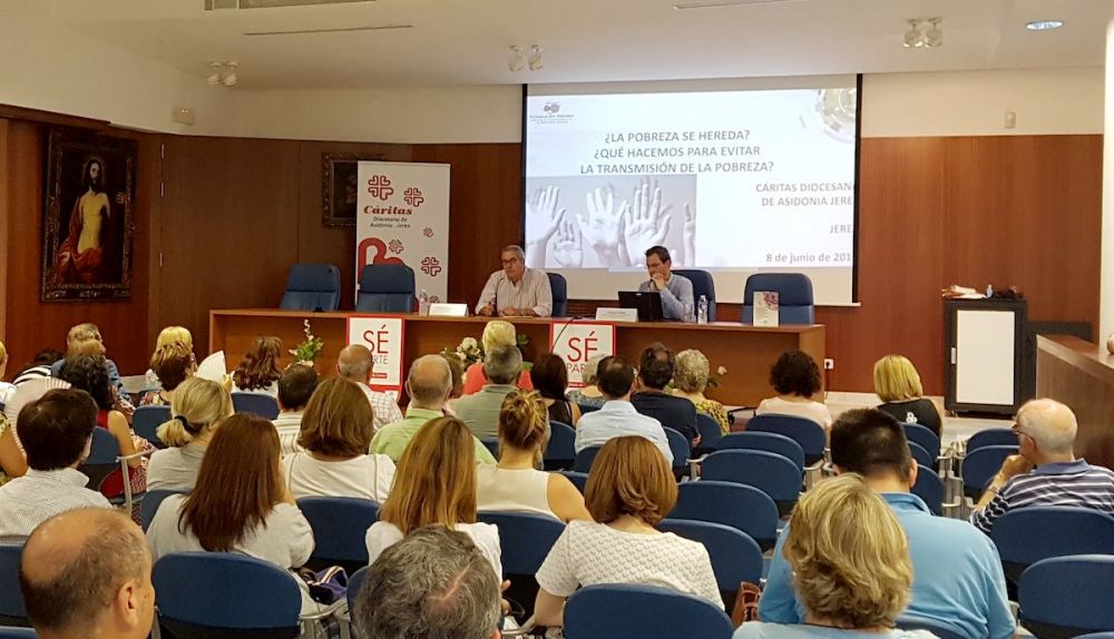 Francisco Domouso, director de Cáritas Diocesana de Asidonia-Jerez, es el encargado de presentar a Raúl Flores, miembro de la Fundación Foessa, que ha elegado un estudio denominado La transmisión intergeneracional de la pobreza: factores, procesos y propuestas para la intervención. Flores asegura que "aquello que la familia tiene, o de lo que carece, va a ser crucial en lo que los niños o niñas reciben de sus padres, ya que los valores, las actitudes, los hábitos, la motivación, habilidades… son elementos que adquirimos en nuestros primeros años de vida en el seno familiar”.