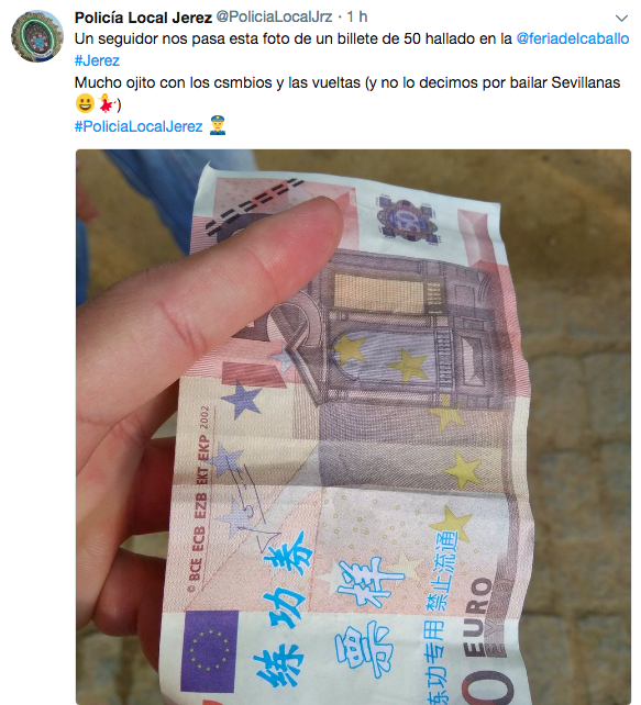 Las prisas y las bullas que vienen muchas veces aparejadas a la Feria del Caballo son aprovechadas por delincuentes y timadores para hacer de las suyas. La Policía Local de Jerez ha publicado en su cuenta de Twitter una fotografía, mandada por un ciudadano, de un billete falso de 50 euros encontrado en la Feria.
