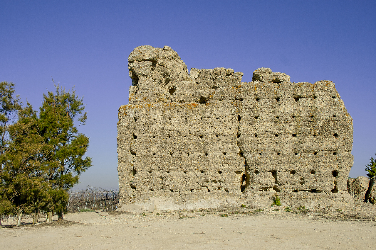 Observando los restos de los muros de la torre puede apreciarse que la altura de las tapias es aproximadamente de unos 80-90 cm, llegándose a contar hasta 11 filas de tapias –la última muy destruida- en los sectores más altos de los paredones. La distancia horizontal entre los mechinales es también variable, siendo la más frecuente entre 75 y 80 cm. El muro orientado hacia el este se ha desplomado, encontrándose en el suelo grandes bloques compactos que pueden corresponderse con otras tantas tapias, lo que nos da idea aproximada de sus dimensiones. Tanto en ellas como en los cortes de los muros que han quedado al descubierto, descubrimos un grosor cercano a un metro. La longitud de estas tapias (o lo que es lo mismo, de los cajones utilizados en el encofrado), se acerca en algunos casos a los dos metros.