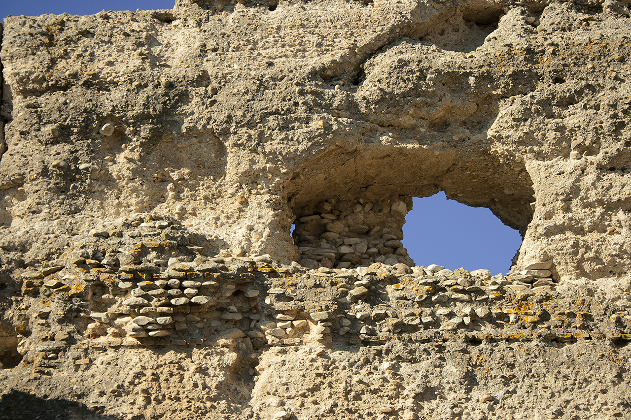 Cuando estos cajones se llenaban, apisonando las capas de argamasa fuertemente, y una vez que el mortero se había fraguado, se separaba el encofrado y se trasladaba para seguir completando el muro por hiladas horizontales. Completada la primera, se avanzaba en altura situando las tapias de manera contrapeada para evitar que las juntas verticales quedaran superpuestas, ganando así el muro en solidez. Para ello, como describen los mencionados autores, sobre la tapia ya terminada “se colocaban los durmientes, agujas de madera instaladas en sentido transversal que servían para sostener el siguiente cajón. Estas agujas sobresalían por las caras exteriores del tapial y disponían de muescas en las que se introducían los costales verticales” (2). Estas maderas podían disponerse a todo lo ancho del muro o, como se aprecia también en esta torre, sin atravesarlo en su totalidad, utilizándose para ello dos trozos independientes, uno para cada lado del muro, que penetran unos 40 cm. Al crecer en altura las tapias, estas maderas sobresalientes que se habían utilizado para apoyar los cajones del encofrado, quedaban incrustadas en el muro y eran retiradas o aserradas. Con el tiempo, al desaparecer por distintos motivos, han ido dejando esos huecos tan llamativos que salpican regularmente los muros de la torre –los mechinales- algunos de los cuales han incrementado su tamaño original debido a la erosión.