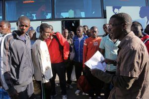 Un grupo de subsaharianos recibe instrucciones a su llegada al aeródromo jerezano. Foto: Juan Carlos Toro.