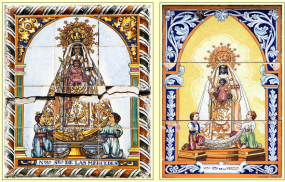Como se ha indicado, la variedad de representaciones, formatos y composiciones de los azulejos devocionales dedicados a la Virgen de la Merced que encontramos en el entorno rural es muy amplia. Como contraste sirvan una de las más modernas y una de las más antiguas. La primera, corresponde a la zona central del retablo de la Capilla de los Caminantes de la Cartuja, dedicado a la Virgen. Obra de mediados de los 80 del siglo pasado, fue realizado por el Taller Águilas 25, de Sevilla y firmado por el ceramista Juan Aragón Cuesta, nos ofrece, en treinta y cinco piezas, una elaborada composición. La segunda, todo un prodigio de sencillez y armonía, se conserva en la fachada del cortijo de Mesas de Santiago. En un cuidado dibujo de sutiles y delicados trazos, nos ofrece una preciosa imagen en dos azulejos salidos de la afamada Cerámica Santa Ana.