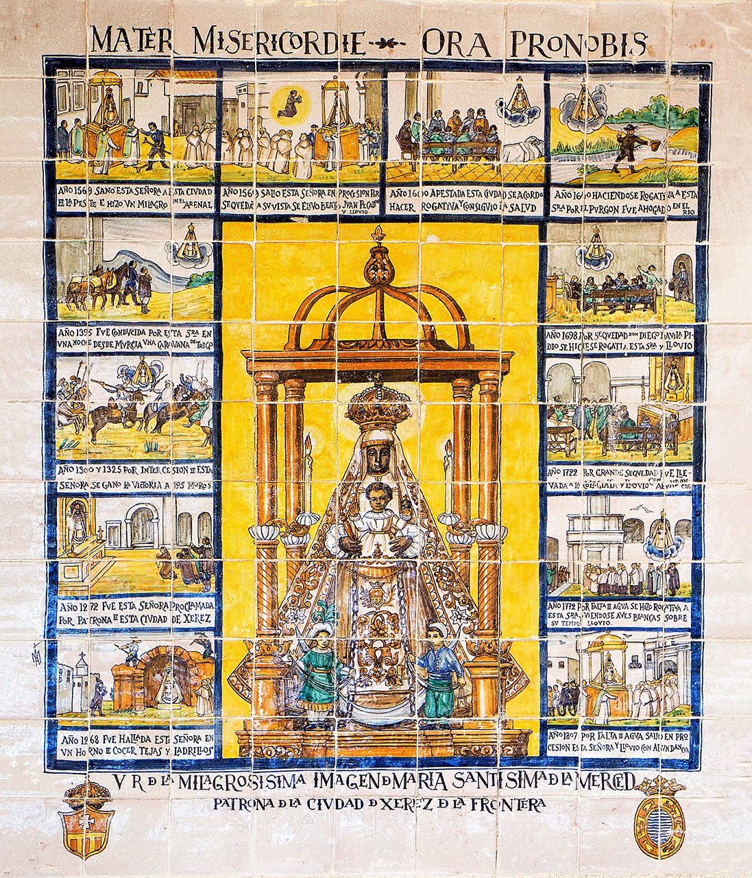 Entre todos ellos, queremos destacar el panel cerámico que se encuentra en la fachada de la Capilla de los Caminantes de la Cartuja de Jerez. Instalado hace unos años, junto a otro del Cristo de la Defensión, está formado por 99 azulejos que tienen como motivo central la "Milagrosísima imagen de María Santísima de la Merced Patrona de la ciudad de Xerez de la Frontera", como puede leerse en el texto que figura al pie. En torno a esta imagen central se disponen 12 escenas en las que se relatan otras tantas intervenciones milagrosas de la Virgen.