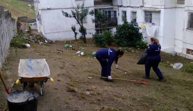 Una brigada de 22 personas realiza labores de limpieza, retirada de escombros, basura, poda de arbolado y desbroce en las barriadas de Federico Mayo, Parque de La Hoyanca y Estancia Barrera. Esta brigada de operarios, que combina personal de Infraestructuras, Medio Ambiente y Distrito Sur, ha culminado ya la retirada de centenares de kilos de basura y escombro en la parcelas comunes de los bloques de vivienda en el caso de Estancia Barrera, y centran ahora su actuación en los barrios colindantes.